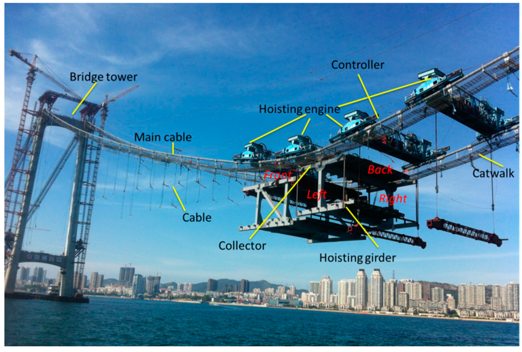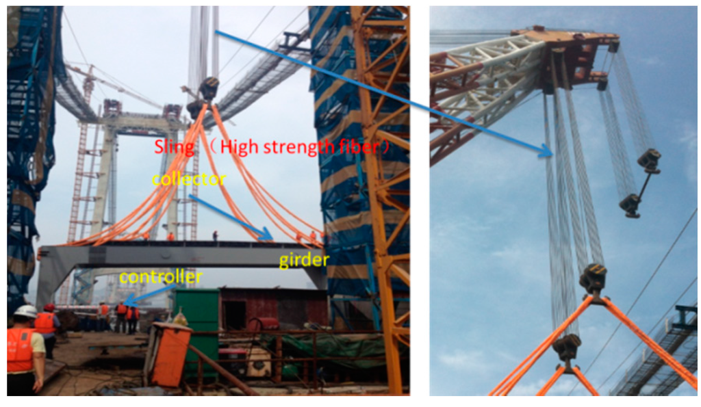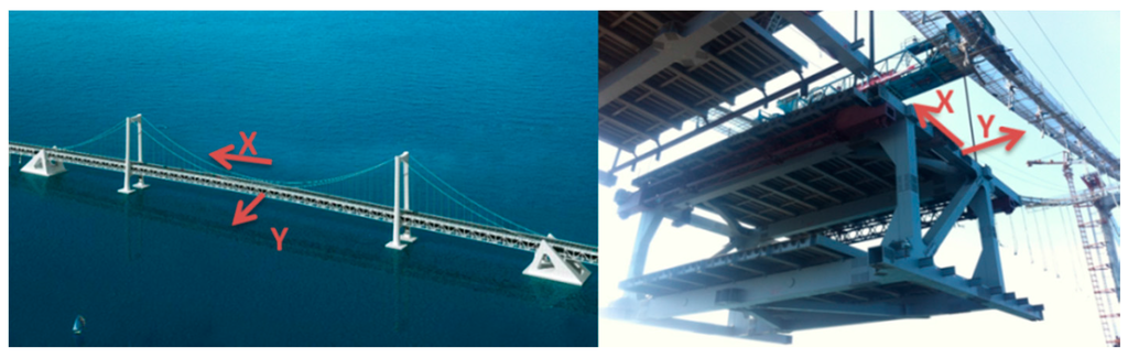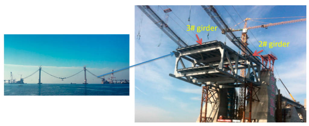 The girder which is No. 22 in Figure 1 on the middle span weighed 372.22 t and was hoisted using two cranes. Two cranes were stretched across the two primary cables and worked together to lift the second girder into place; thus, both cranes had to raise the girder at the same rate to prevent imbalance. Therefore, the angle of the girder must be determined in real time to ensure a synchronous hoisting operation.