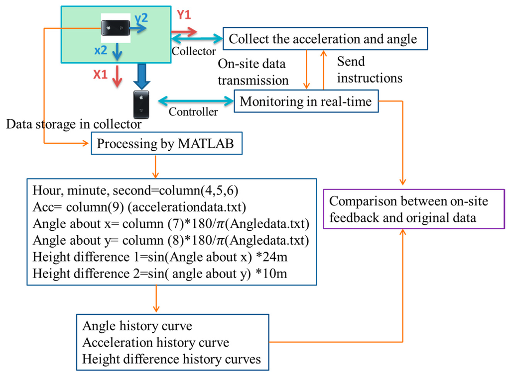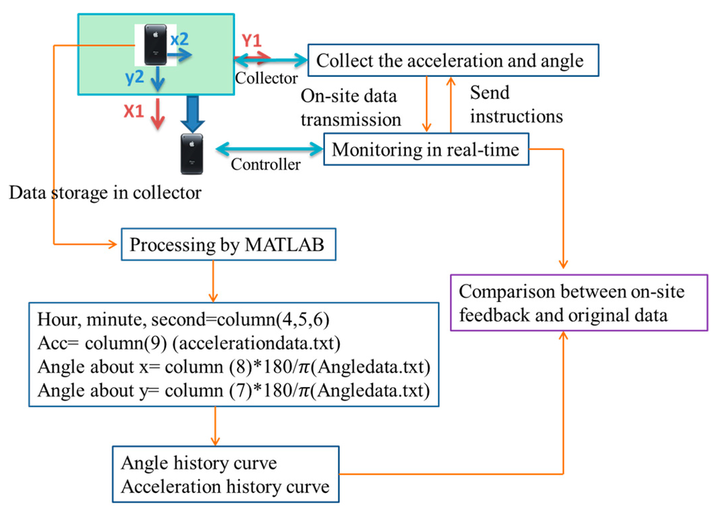 In order to compare the on-site feedback and original data collected by collector, the related algorithm is shown in Figure 16. The data is collected and stored in the collector phone, and named as Angledata.txt and acceleration.txt. The data files can be exported, and then processed by MATLAB to obtain the time-history curves. In the data file, the first to the sixth column represents collected time, they are year, month, day, hour, minute and second respectively. In this test, hour, minute and second are used. In the accelerationdata.txt file, the seventh to ninth columns represent the acceleration of three axes, so the vertical acceleration is the ninth columns. In the Angledata.txt file, the seventh to ninth columns represent the angle around three axes. From Figure 15, it can be seen that, the angle around x-axis of the girder measured by smartphone is the angle around y-axis. So the eighth and seventh column is used to calculate the angle around x-axis and y-axis respectively. The original data in smartphone collected in radians, a transformational relation is used in the data processing. After the processing, the angle-history curve and acceleration history curve can be obtained to compare with the on-site feedback.