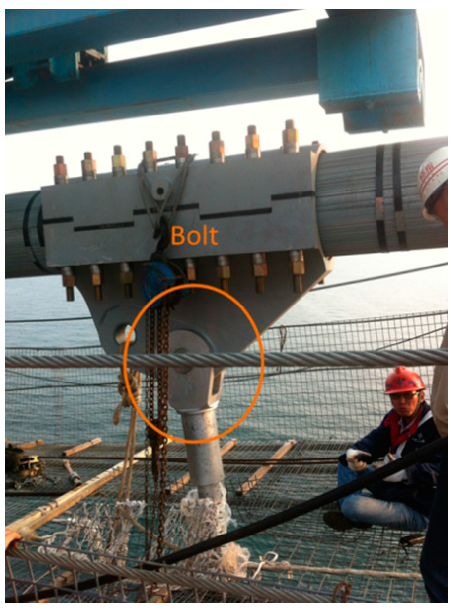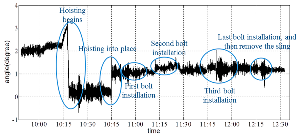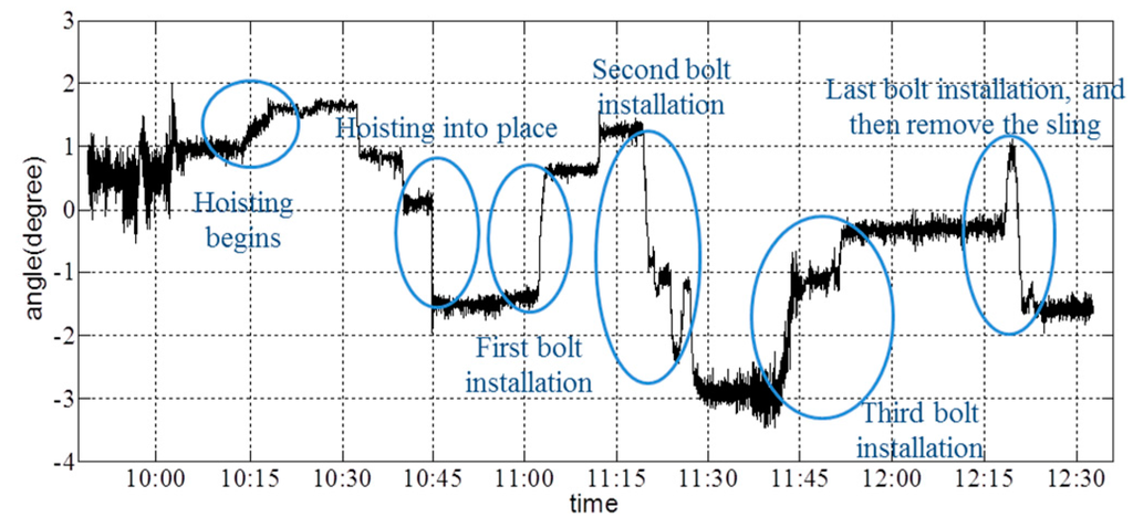 Depending on the records of the field operator, the collector started to gather data at 9:48; the hoisting of the girder began at 10:14; the girder was lifted to a given height by 10:45; and four bolts (i.e., the connection between the cable and girder, which is shown as Figure 20) were installed completely by 12:19. The resultant deformation was severe when workers started to remove the sling. From Figure 17, Figure 18 and Figure 19, it is shown that the angle changed due to the action of hoisting in every phase of the hoisting procedure. Before each bolt was secured in its respective hole, the angle was adjusted to match up each bolt hole. Throughout the hoisting process, the acceleration and angle changed only marginally, and all disturbances remained within the acceptable ranges. Based on the preceding analysis, the girder remained stable during this hoisting operation, which is consistent with the phone investigation.