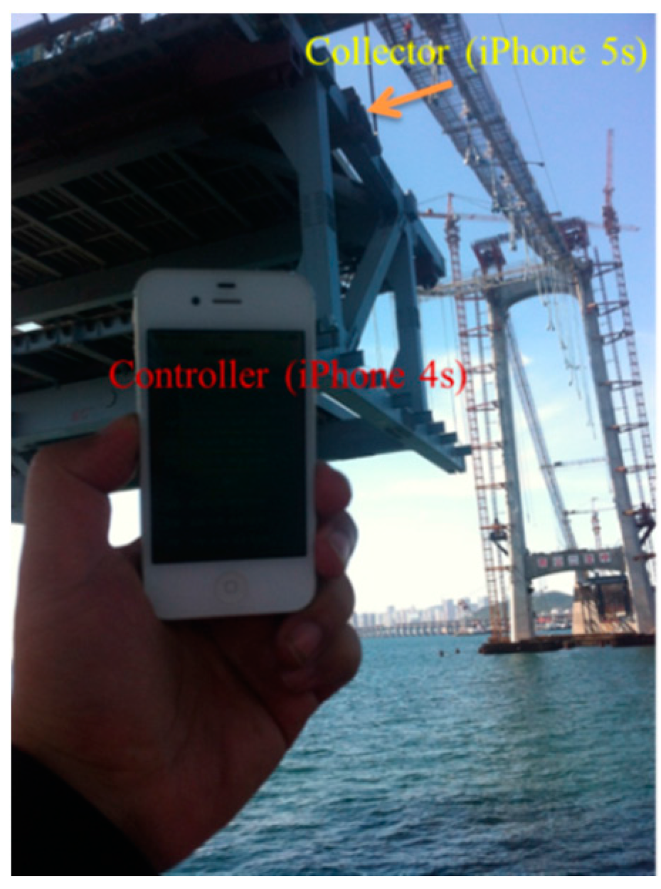 In this monitoring procedure, an iPhone 5S was used to collect data and return information to the controller, and an iPhone 4S served as a controller to receive the returned data and provide information to the operators. The on-site hoisting procedure is shown in Figure 21. The collector (i.e., the iPhone 5S) was fixed onto the girder to be hoisted, and the controller was operated by operators on a catwalk. The arrangement of the collector is shown in Figure 22, and Figure 23 shows the position of the collector and controller at the beginning of the hoisting operation; at this point during the hoisting procedure, the controller was on the boat. After the girder was raised from the boat, the controller was taken to a catwalk for the remainder of the hoisting procedure.