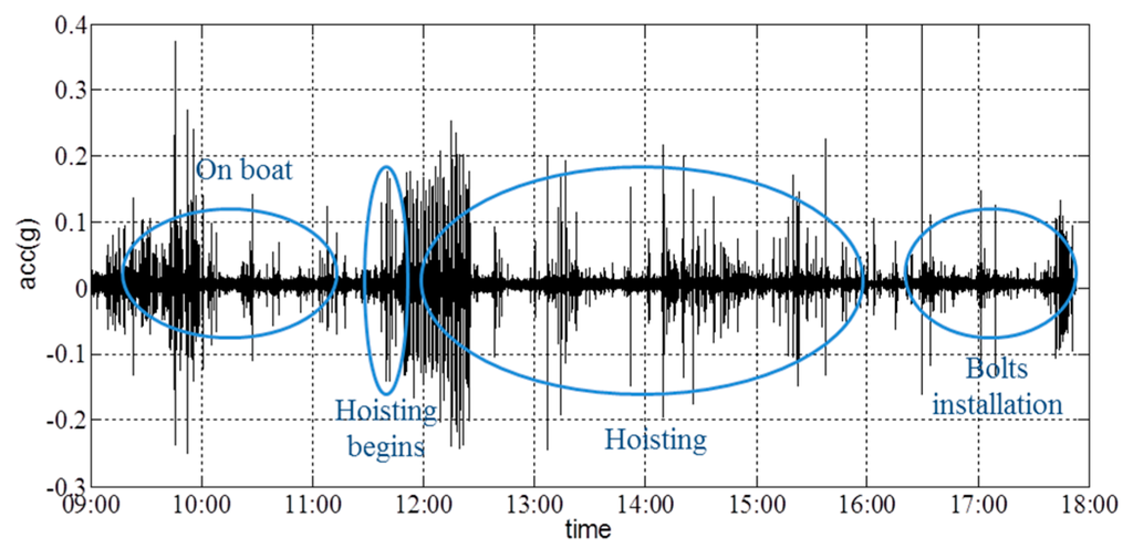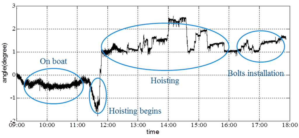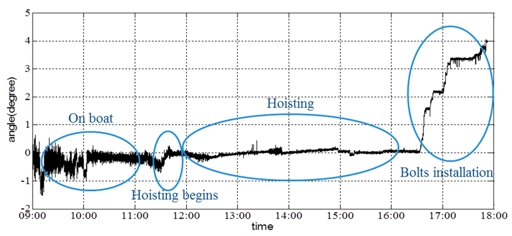 The duration of the hoisting process was 3 h. There was no warning information on the controller during the whole procedure. At the beginning, the four corners of the girder must be hoisted simultaneously. Therefore, real-time angle information must be obtained to evaluate the position of the girder and to provide information to operators. The vertical-acceleration time-history curve of the collector is shown in Figure 17.