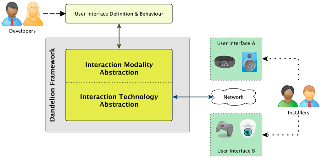 In Ubiquitous Computing (UC) and Ambient Intelligence (AmI) systems the interaction with the user is a critical aspect []. These systems are strongly related to people and their needs, providing functionalities assisting them in their daily life wherever they may be located. They are expected to provide a natural user experience, in which the UI blends in with the environment [,], reducing interaction to the minimum through interaction devices and modalities adapted to the user needs and abilities. Thus, to construct this kind of user experience, UC and AmI developers need to build the user interfaces (UIs) of their systems relying on a combination of different devices distributed throughout the physical environment [,]. These devices usually correspond to different types of systems coming from different manufacturers and technologies. Additionally, adapted and natural user interfaces require different interaction modalities (voice, touch, tangible UIs, gestures, etc.) and these must be chosen depending on the type of user or the environmental conditions. For example, a voice-based UI may be a good option for a blind user in their home, but is probably a poor choice for a deaf user, or even for the blind user in a noisy environment like a crowded street.