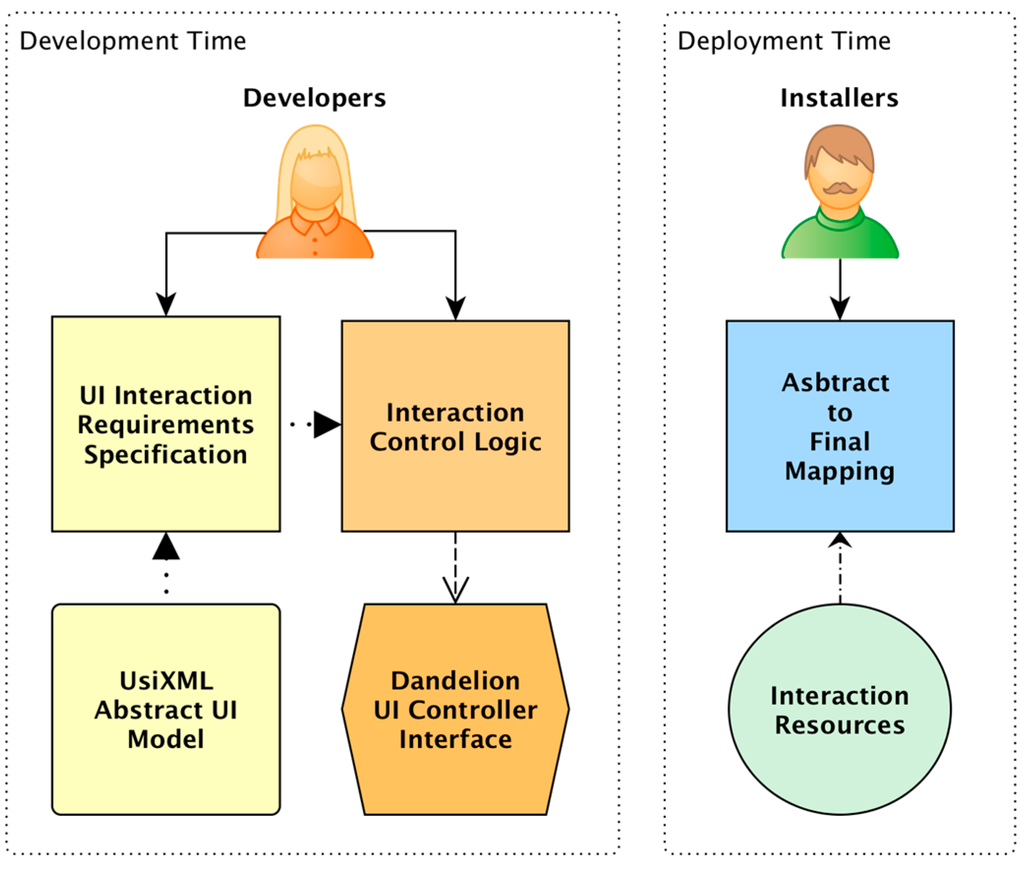 By taking advantage of this characteristic of Dandelion, developers can work completely at the abstract level following the process illustrated in Figure 3. It is at deployment time where the transformation from abstract to final is specified by the installer of the system. This specification, essentially a mapping between abstract and final components, is used by Dandelion at run-time to translate the abstract interaction operations into real interactions with the users.