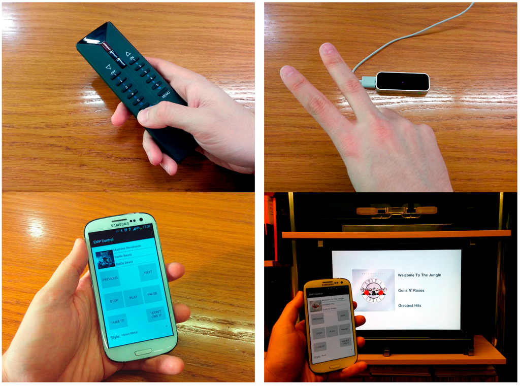 Finally, the music style selection interaction facet can be physically implemented in multiple ways using different FIOs to build various final UIs adapted to diverse usage scenarios. Figure 7 shows four different ways of physically implementing the selection of music styles: using a home automation device, in particular a KNX remote controller for home automation systems, hand and finger gestures to select between the different music styles using a Leap Motion device, as an Android application for smartphones that allows the selection of the music style using the touch screen of a smartphone and using a TV display and a Kinect camera.