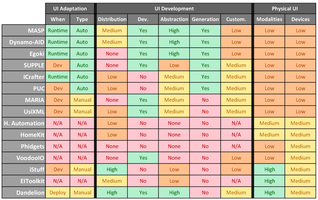 For example, there is a group of solutions that perform quite well in the Physical UI aspect, but they have really poor performance in UI Adaptation and UI Development features. This is the case of technologies like HomeKit, Phidgets, EIToolkit. While they can be used as supportive technologies to build ad-hoc PUIs, they are designed to provide remote access to physical devices, thus they are good at managing devices, but they do not support user interaction concepts, nor do they provide tools to design or build UIs.