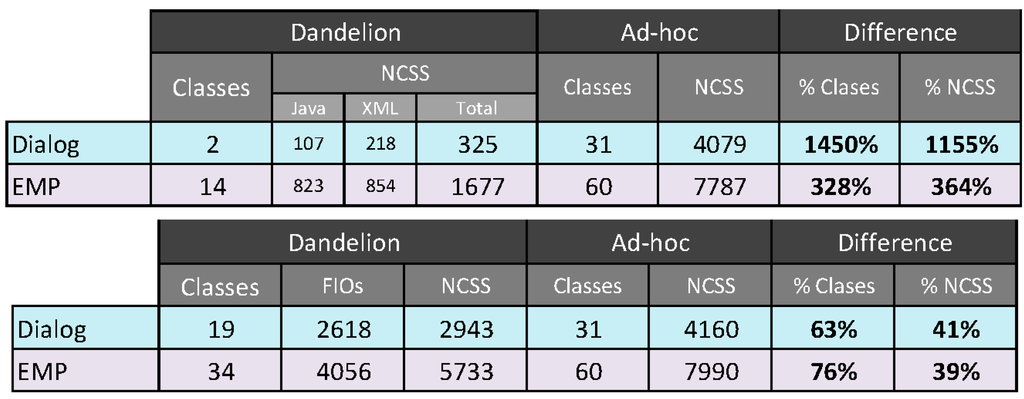 Nevertheless, it is important to note that in the results show in the first table of Figure 9, we are assuming that the developers already have all the FIOs required for the five different interaction devices. Dandelion has been designed to leverage the existence of FIOs for different technologies, while this is not always the case, especially the first time that a team uses Dandelion, the fact is that FIOs can be very reusable between different projects, and are easy to implement, as shown by the results of the second table in Figure 9, where we have added the number of public classes and NCSS of the different FIOs to Dandelion columns, and even with that, using the interaction technologies directly requires about a 41% more development effort. Similar results can be seen for the EMP case, where the benefits of using Dandelion are not so dramatic but still huge, the ad-hoc system implies an increment of 328% in the number of classes and 364% in NCSS. The difference with the Dialog example arises because we are not only counting UI code, but also system logic code, which in this case is much bigger than in the Dialog example.