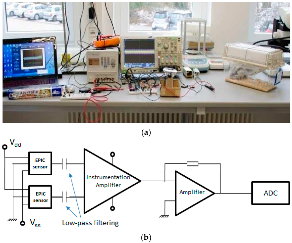 In this test, the mouse was placed on a small raised platform, which carried two EPIC sensors. The signal shown in Figure 7a has been obtained from the mouse with one paw in contact with one of the EPIC sensors, and the other in contact with the grounding (GND).