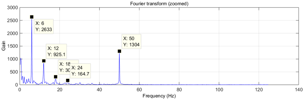 Figure 6 shows a significant component at 50 Hz, corresponding to electrical noise. However, there is an interesting regular arrangement at 6, 12, 18, 24, 30 Hz and so on (6 Hz multiples) of decreasing power. This was initially assumed to be electrical noise of unknown origin and its harmonics that the captured signal shows, but further tests discarded this possibility, since this signal was captured only when the mouse was present.