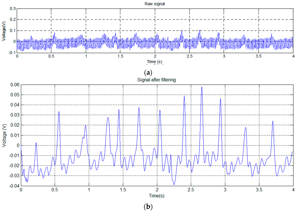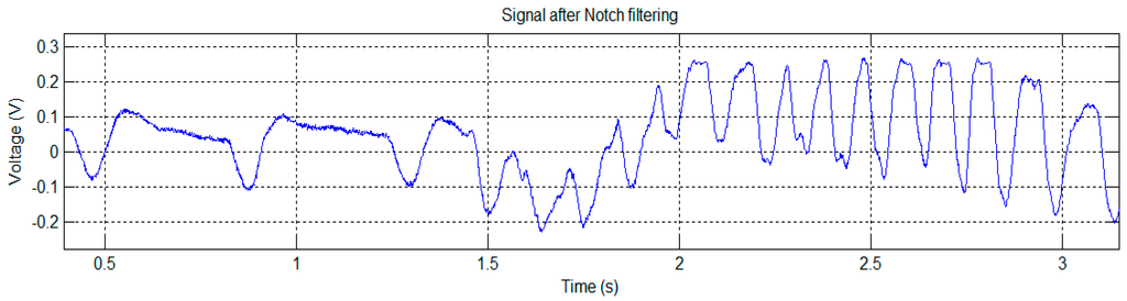 Since the (mainly 50 Hz) noise in Figure 7a masks the detailed signal characteristics, we used a notch filter to obtain the signal shown in Figure 7b.