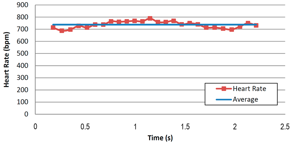 Using this commercial system, 50 heart rate samples were captured in two mice, being the average values 668 and 701 bpm, respectively, as is shown in Figure 13. The value of 687 bpm which we got from the analysis of Figure 11 is therefore within the range obtained with the BP-2000 system.