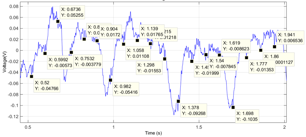 In this trial we were able to obtain the signal with two limbs of the mouse in contact with two sensors. Figure 15 shows the result after notch filtering the raw signal.