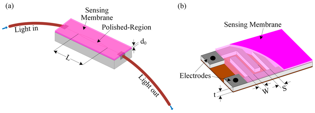 Schematic diagram of the temperature-sensing elements: (a) Side-polished optical fiber with a sensing membrane; and (b) IDC sensing element.