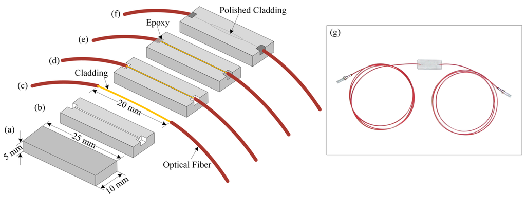 Step-by-step fabrication procedure of the side-polished fiber-optic device: (a) Quartz block; (b) Creating the V-groove on the quartz block; (c) Removing the jacket of the optical fiber; (d) Bending the removed-jacketed-portion of the optical fiber and placing it into the V-groove of the quartz block; (e) Using epoxy; (f) Polishing the fiber-optic quartz block; and (g) A photograph of the fabricated side-polished fiber-optic device.