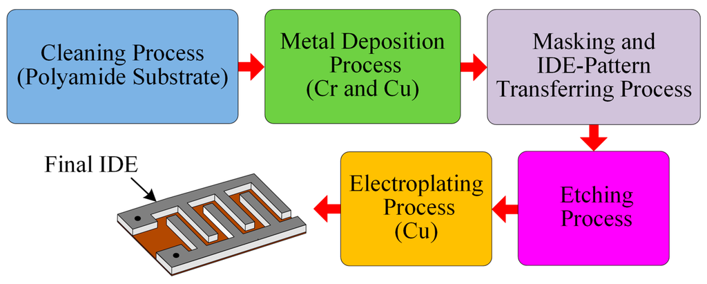 We prepared IDEs to form an IDC-based temperature-sensing element. To make an IDC temperature-sensing element, we first had to fabricate an IDE. Then, we deposited Rhodamine-B including sensing membrane into the IDE to make IDC. We prepared an IDE with a thickness of approximately 22 µm on a 4 × 2 cm polyimide (PI) substrate with 40 pairs of fingers. We applied the vacuum evaporation method to make a thin film of Cr and Cu on the PI substrate, respectively. The thicknesses of the Cr and Cu films were approximately 10 nm and 15 nm, respectively. The IDE’s photomask pattern was transferred onto the thin metal film. Then, a chemical etchant was used to etch the unmasked pattern to obtain thin IDE fingers on the PI substrate. We applied a Cu electroplating method to increase the thickness of the Cu electrodes. Finally, we cut the residual PI substrate. Figure 3 shows the various stages used to fabricate the IDE. To measure the IDE thickness, the width of the fingers, and the distance between fingers, we used a scanning electron microscope (SEM) (S-4800, Hitachi, Ibaraki, Japan); the measured values were approximately 22 μm, 100 μm, and 100 μm, respectively.