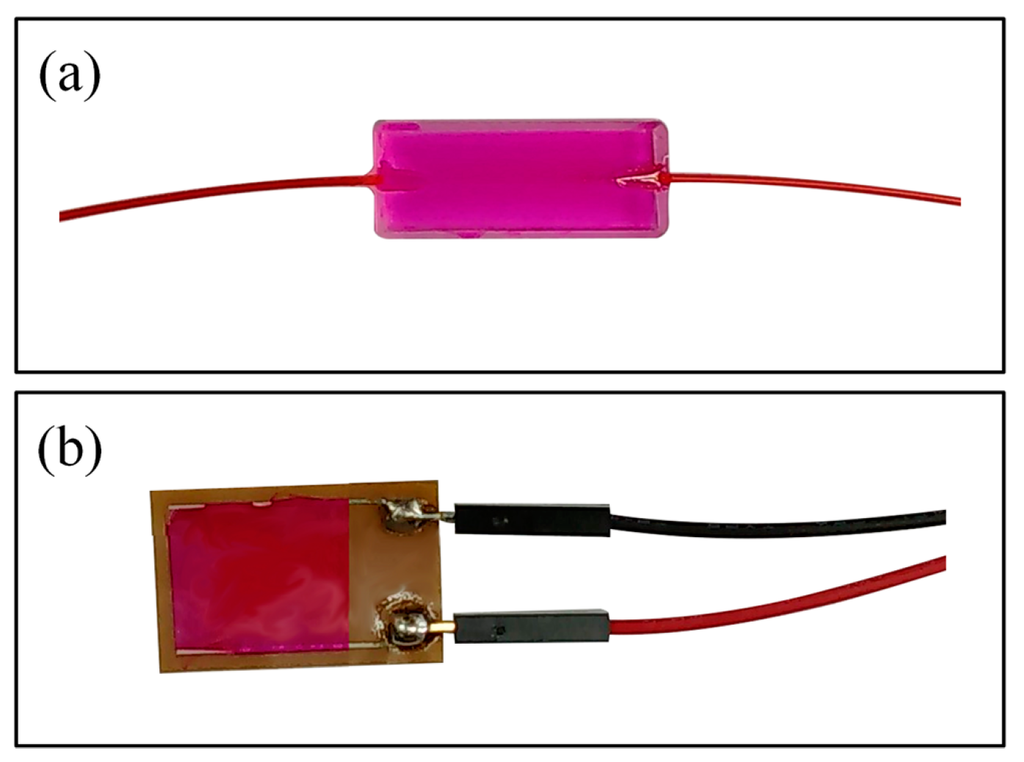 The capability of a chemical compound to change color owing to a change in temperature is called thermochromism; a chemical compound that exhibits this property is called a thermochromic dye [45]. To create the temperature-sensitive sensing membrane, we used Rhodamine B [46,47] thermochromic dye, a polymer, namely, polyvinyl chloride (PVC), and a DMAC solution. The molecular structure of the thermochromic dye (Rhodamine B) is shown in Figure 4. We obtained chemicals from the Sigma-Aldrich Chemical Corporation (Seoul, Korea) and used them without any further purification. First, 0.020 g of Rhodamine B was dissolved in the DMAC solution. DMAC is an aprotic solution; therefore, it does not react with the dye molecule. Then, we added 0.035 g of PVC powder to the Rhodamine B solution and sonicated it for 10 min to obtain a temperature-sensitive dielectric solution. Before depositing the sensing solution, we cleaned the side-polished fiber-optic device and IDE with ethanol, methanol, and deionized (DI) water, respectively. Then, we dried both the side-polished fiber-optic and the IDE in N2 gas. We used a syringe to take 0.25 mL of sensing solution to deposit the solution on the side-polished fiber-optic and the IDE. Then, we used a spin coater to deposit the solution smoothly on the side-polished fiber-optic and IDE and dried the devices at room temperature to obtain fiber-optic and IDC temperature-sensing elements. The fabricated fiber-optic and IDE temperature-sensing elements, after deposition on the sensing membrane, are shown in Figure 5a,b, respectively.