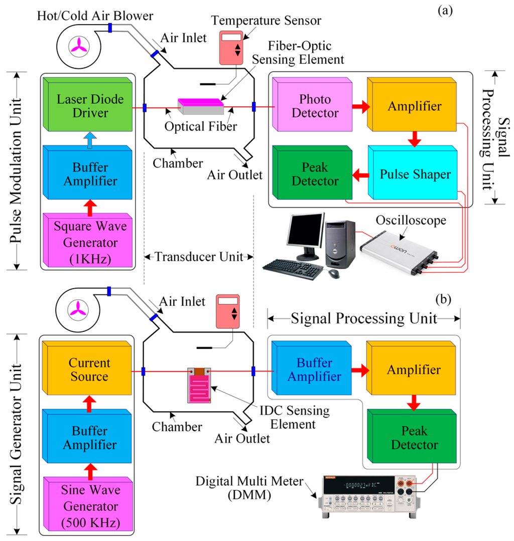 Schematic diagram of the experimental setup of the proposed temperature sensing system: (a) Fiber-optic PWM and (b) IDC.