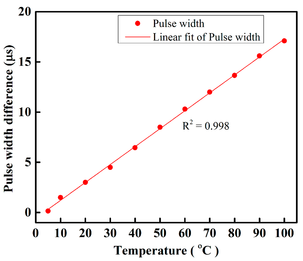 We also prepared an IDC temperature sensor to measure the temperature from 5–100 °C. The capacitance of the IDC sensing element, the capacitive impedance, and the phase shift of the received signal of the proposed IDCs are functions of the temperature variation. The waveform response for phase shifting is shown in Figure 7e; we found that at 3 °C, there is no phase difference; however, when the temperature increases, a phase shift occurs between the received sensing and reference signals. The phase shift difference between the received sensing and reference signals at 50 °C was ~14.75 ns and was measured using an oscilloscope; the results are shown in Figure 7f. The temperature sensing ability of the proposed fiber-optic PWM sensing system under different temperature is shown in Figure 8. From this figure, we found that the relative pulse width linearly increases as the temperature increases and its correlation coefficient R2 was about 0.998 with a high temperature sensing ability. The sensitivity of the proposed fiber-optic PWM sensing system was ~178 ns/°C.