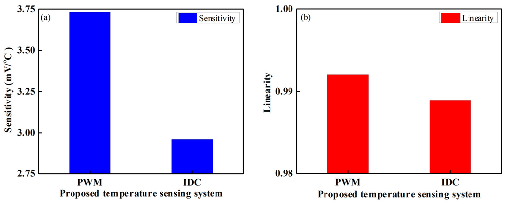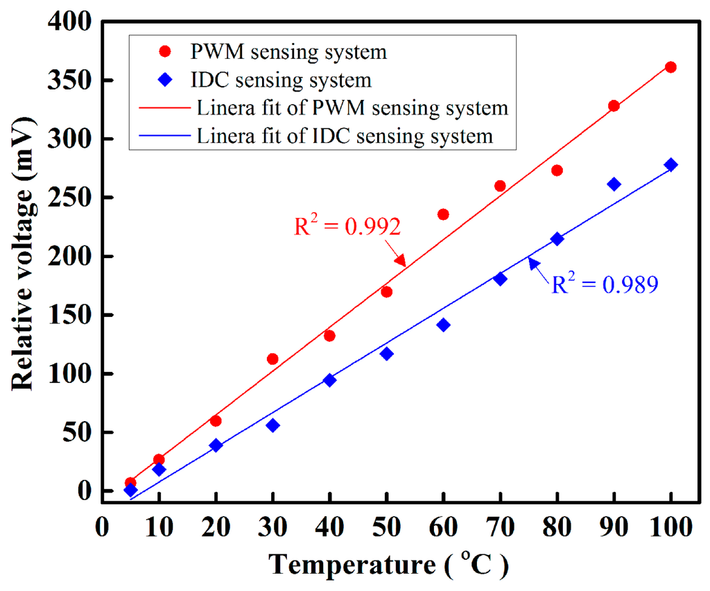 Figure 10 shows the sensing performance of the proposed temperature-sensing systems. This figure shows that as the temperature increases the relative voltage linearly increases. In Figure 10, we used linear curve fitting to determine the slope, i.e., the sensitivity of the proposed fiber-optic PWM and IDC temperature-sensing systems. The sensitivity of the proposed fiber-optic PWM and IDC temperature-sensing systems was 3.733 mV/°C and 2.96 mV/°C, respectively. From the above described results, we determined that the fiber-optic PWM sensing system offers greater sensing ability than the IDC temperature-sensing system.