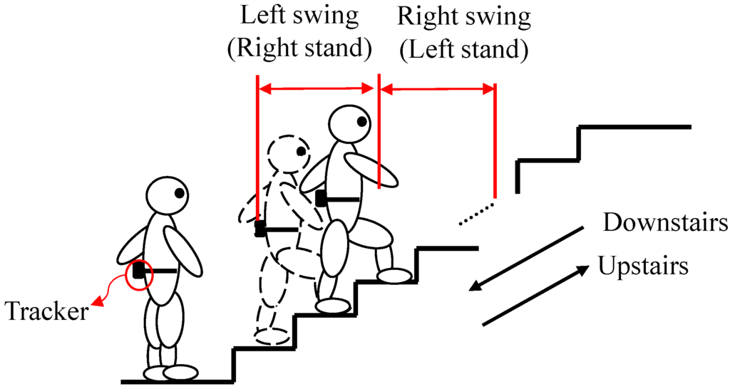Currently, studies on stair-walking tests for children and adolescents with ID are limited. Most studies can be partitioned into two approaches. The first approach is to evaluate stair ability through expert scoring, an example of which is the Dynamic Gait Index (DGI) [18]. The final testing item of the DGI concerns stair-climbing performance, and the score is determined according to a therapist’s observation, ranging from 0–3 points. However, the score represents only an overall description of stair-climbing performance (e.g., walking with or without a rail). Pattern changes and movement details cannot be measured objectively through expert scoring. Therefore, numerous other studies have adopted the second approach, that is, using a motion capture system (i.e., based on optical cameras) and force plates to measure the gait; this has been considered the gold standard in the industry and at most hospitals [3,4,5,6,7,8,9]. Such systems can detect comprehensive temporal and spatial gait features. However, this approach has time and space limitations in stair-walking testing. For most participants with ID, even though a motion capture system can measure gait completely, the less limiting approach is to develop an easy-to-use, wearable, and portable tool that can be applied in daily or unrestricted-distance measurement for eliciting awareness of gait abnormalities throughout childhood and adulthood [10].