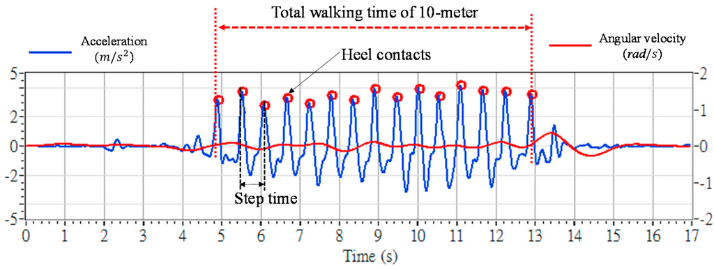 Since we mounted the sensor on the lower back of the trunk, each peak point in Figure 3 can be identified as the time that a heel (either left or right) contacted the ground [27]. From this observation, we can identify the gait events and use the peak points to derive two parameters: