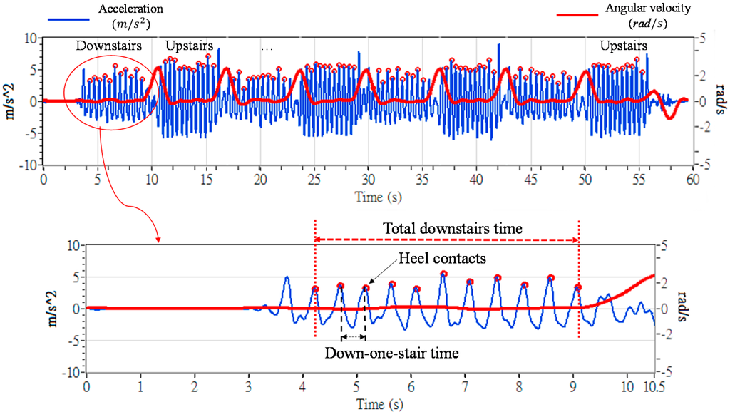 Upstairs and downstairs signals. The horizontal line represents time (s), the left vertical line shows the acceleration (m/s2), and the right vertical line shows the angular velocity (rad/s), respectively along and about the X-axis of the tracker.