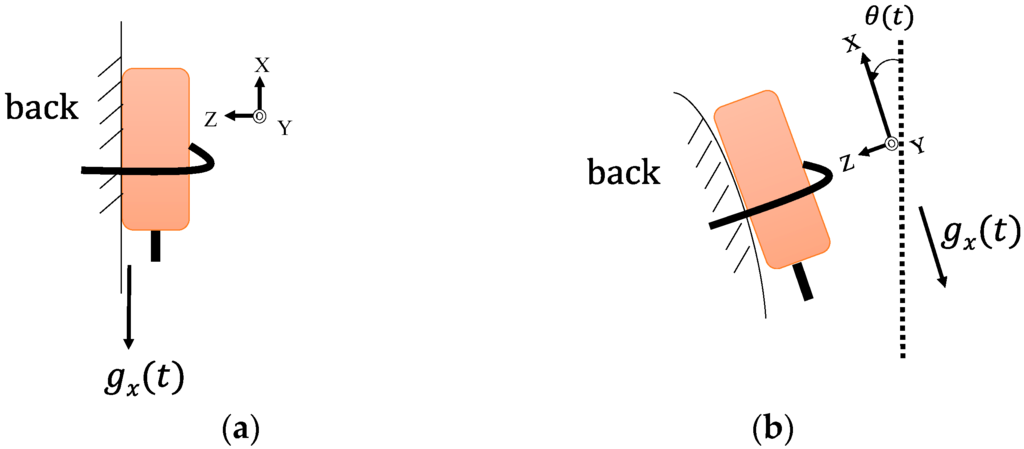 The output of the accelerometer is composed of the “free” acceleration of the sensor itself and the intervention of gravity on the sensor. We take Figure 5 for an example. Figure 5a shows that if the tracker is worn vertically, gravity will affect the X-axis by 1 g (i.e., ). If the tracker is worn with an inclination angle in plane X-Z, as shown in Figure 5b, gravity will have a component on the X-axis by . Then we obtain: