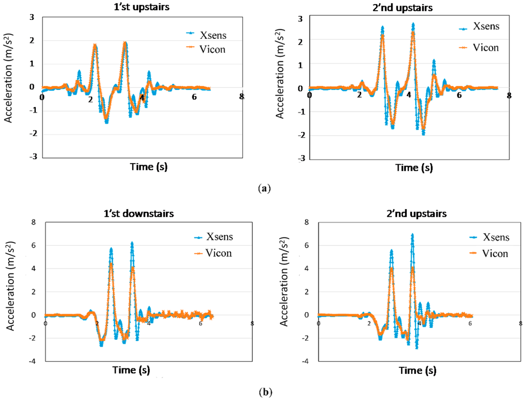 Validation of the Xsens accelerations (a) upstairs; and (b) downstairs with Vicon data.