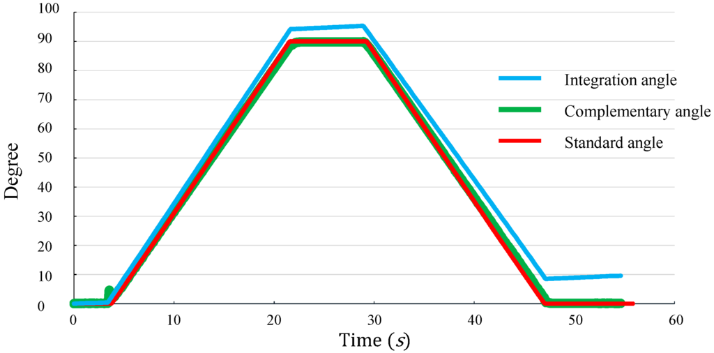 Lastly, we verified that drift was eliminated from the gyroscope. An Xsens tracker was mounted on a step motor. The step motor rotated from 0° to 90° and then rotated back to 0°. Figure 7 shows comparisons of the rotation angles obtained from the gyroscope with the angles obtained from the Vicon system. The first curve in Figure 7 was calculated by integrating the rotation velocity of the gyroscope output, the second curve was calculated by using the complementary filter (Equation (3)), and the third curve was the angle of the step motor (gold standard). As the figure shows, the first curve exhibits a significant drift effect after a certain time. A 10° bias was generated after the motor stopped. Furthermore, the complementary filter of the third curve shows that the drift can be eliminated effectively.