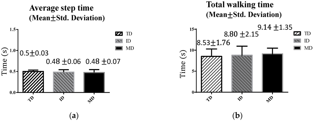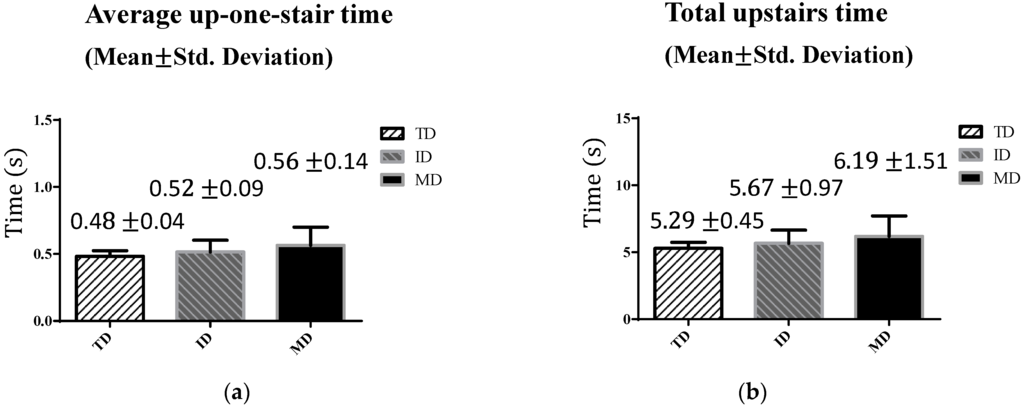 Figure 9 shows the upstairs walking performance levels of three groups. We compared two parameters: the average up-one-stair time and the total upstairs time, as defined in Figure 4. Unlike straight-line walking, Figure 9 shows that, on average, the adolescents with ID and MD required more time to finish the test than the TD adolescents did. Despite these differences, all adolescents could walk one step in less than 1 s on average. In addition, the standard deviations for the ID and MD groups were higher than that of the TD group, which implied that the two groups demonstrated greater variability during stair-walking.