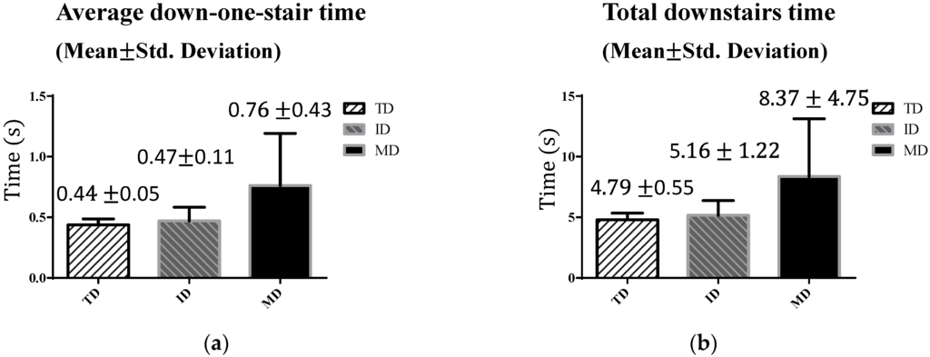 Figure 10 shows the downstairs walking parameters of the three groups. On average, the TD adolescents and the adolescents with ID required less time to walk down one stair (i.e., <0.5 s) and all stairs (i.e., <6 s). However, the adolescents with MD showed relatively longer down-one-stair time (Figure 10a) and, thus, relatively longer total time downstairs (Figure 10b). The average time required for the adolescents with MD to complete 10-step stair-walking was 1.7 times of the TD adolescents (4.79 s). In addition, the MD group demonstrated greater variability.