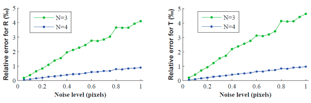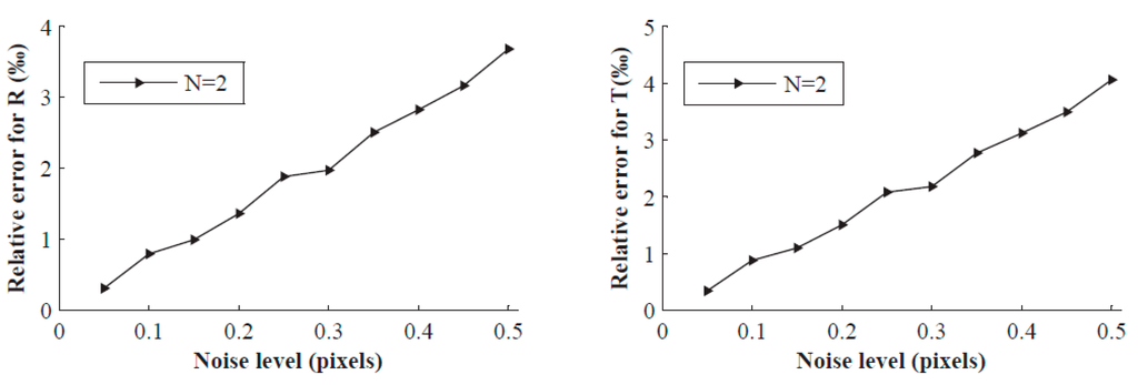 Table 1 shows the intrinsic parameters of two simulation cameras. The camera distortions are not considered. Suppose that the LCCF is the world coordinate frame (WCF), and set the simulation BSVS structural parameters as r = [−0.03,0.47,0.07]T, T = [−490,−49,100]T. The working distance of BSVS is approximately 1000 mm, and the field of view is approximately 240 × 320 mm. The relative deviation of the calibration results and the truth values are used for the evaluation of accuracy. The rotation matrix R is expressed as Rodrigues vector r; then, both the rotation vector r and translation vector T have dimensions 3 × 1. The Euclidean distances of the simulation vectors and true vectors of r and T are used to represent absolute errors; the ratio of absolute error and the corresponding mould of the truth value are then the relative error.