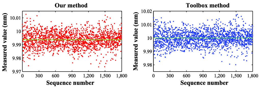 The results in Table 5 show that the RMS error of our algorithm is 0.084 mm, and the relative error is approximately 0.06%; the RMS error of the toolbox method is 0.111 mm, and the relative error is approximately 0.07%. Consequently, it is obvious that our method is slightly better than the toolbox method in measuring the distance of two sphere centres. The standard errors of the measured values show that the measured results by our method are more stable.