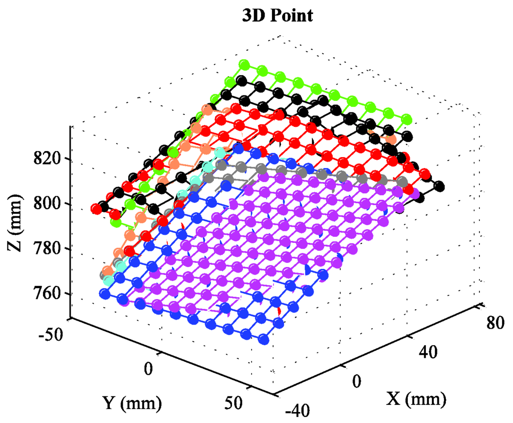 The details of the checkerboard target have been introduced in the preceding paragraph. Because the measured values are too numerous, we represent these values by the scatter plots in Figure 11. Table 6 shows the comparison of errors. For an intuitive display of the calibration results of our method, we reconstruct the 3D points of the checkerboard target, and Figure 12 shows the results.