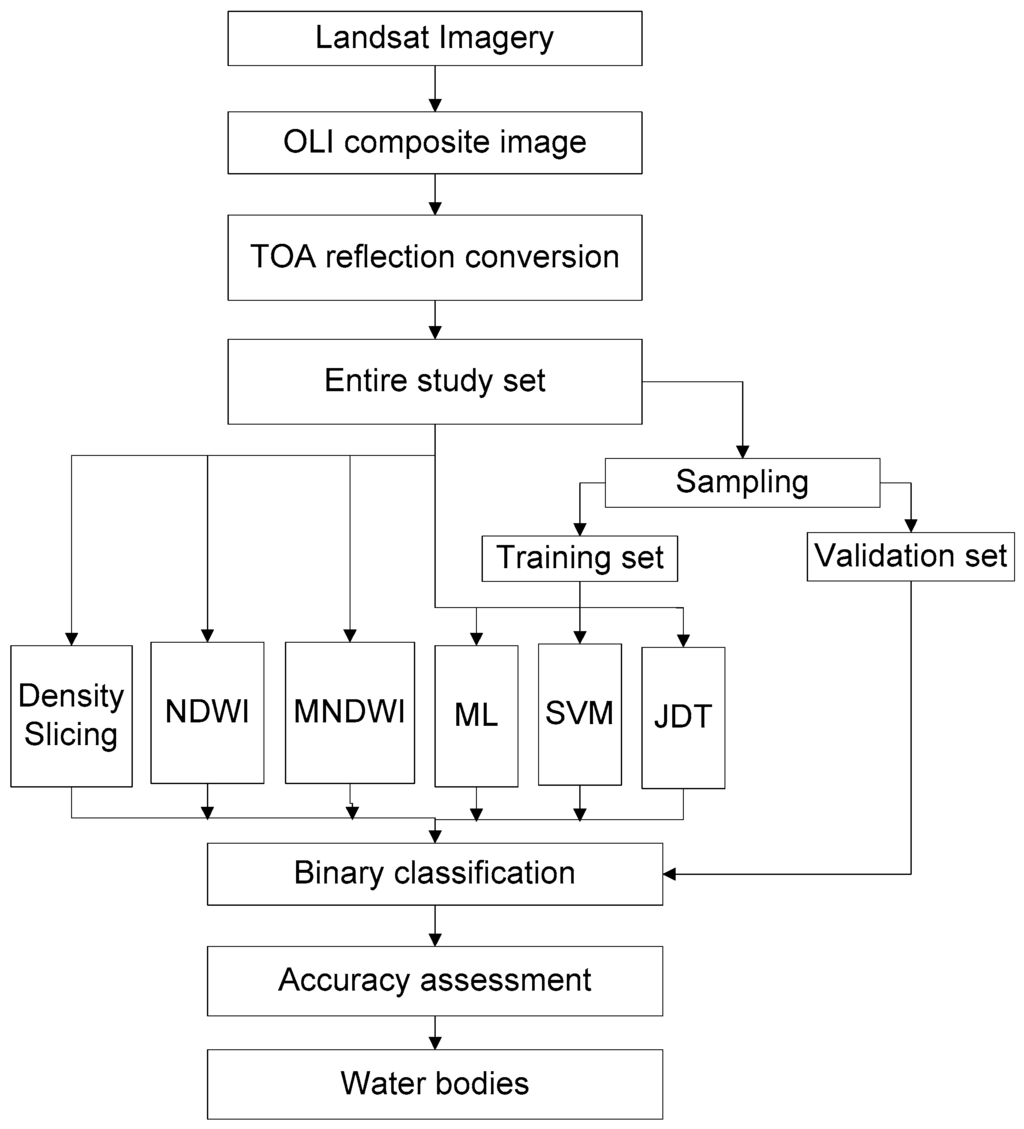 In this study, we applied and explored the effectiveness of a JDT to identify water and non-water bodies using a Landsat 8 OLI image and only its original OLI reflectance bands. Stratified randomly-sampled pixels were labelled based on a digital topographic map provided by the National Geographical Information Institute, Korea, and expert opinions to train (70%) and validate (30%) the model. The JDT model classified 99.83% of instances correctly and had kappa Statistic of 0.9966 and an AUC value of 0.999. The model was used to develop binary water and non-water maps. Similarly, water and non-water maps based on five other methods were developed and cross-compared using a confusion matrix and related statistics. The overall accuracies of density slicing, NDWI, MNDWI, ML, SVM, and JDT were 99.35%, 98.92%, 98.43%, 99.28%, 99.41%, and 99.15%, respectively. Similarly, the kappa coefficients were 0.9870, 0.9785, 0.9687, 0.9856, 0.9883, and 0.9830 for density slicing, NDWI, MNDWI, ML, SVM, and JDT, respectively. Based on these statistics and visual interpretation, almost all methods displayed high accuracies, except MNDWI, which misclassified many non-water features. Seasonal variability should be very carefully noted when identifying water in agricultural areas. Similarly, spatial resolution plays an important role in pixel-based classification of multispectral imagery, it should be carefully considered for the identification of smaller water bodies. In the current study site, using one band (density slicing) or two bands (NDWI and MNDWI) water bodies were identified with high accuracy and yet had many misidentified pixels, whereas ML and SVM also showed high accuracies but used all input bands for classification. However, JDT only used four OLI bands and had much fewer misclassified bodies. Overall, the improvement in OLI imagery shows high accuracy for various methods, including JDT, for identification of water bodies. In the decision tree, the deep blue band was found to have the third-highest information gain, which validates the importance of the band in case of water identification.