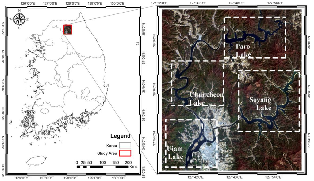 The Northern Han River flows from Gangwon and through Gyeonggi province in the Republic of Korea. A rectangular area in the Northern Han River Basin, located in Gangwon province, was selected as the test site (Figure 2). It is located between 37°50′4.723′′–38°10′1.437′′ N and 127°36′47.037′′–127°58′3.853′′ E. In addition to water, the land cover types at the site are urban, forest, vegetation, and soil. The terrain is complicated, with hilly and plain areas. It consists of four artificial lakes formed by dams in the river: Paro Lake, Soyang Lake, Chuncheon Lake, and Uiam Lake.