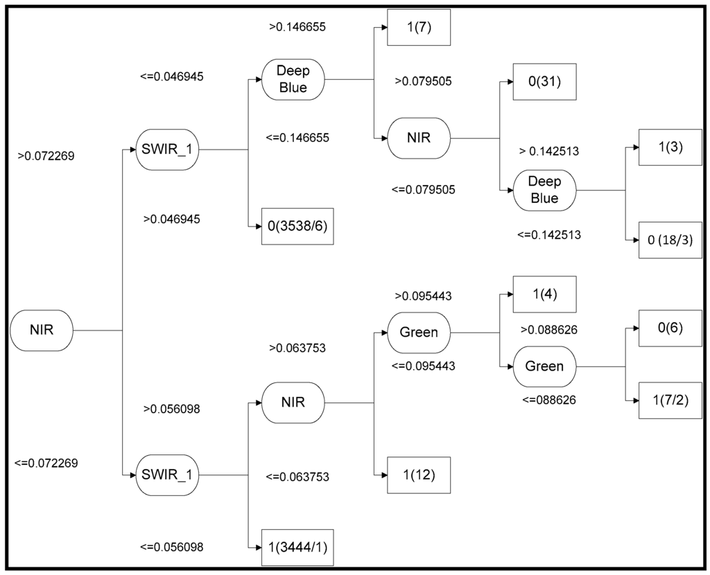 The JDT developed using the training data is shown in Figure 3. The size of the tree is 19, and it consists of 10 leaves. Figure 3 shows that the most important classification role is played by the NIR band, followed by the SWIR1, deep blue, and green bands, whereas the SWIR_2, blue, and red bands were rejected from the decision tree. NIR and SWIR can classify most of the sample points, whereas the deep blue and green bands display less significant classifications. The new additional deep blue band, which is a visible channel specifically designed for water resources and coastal zone investigation showed third highest information gain in the decision tree.