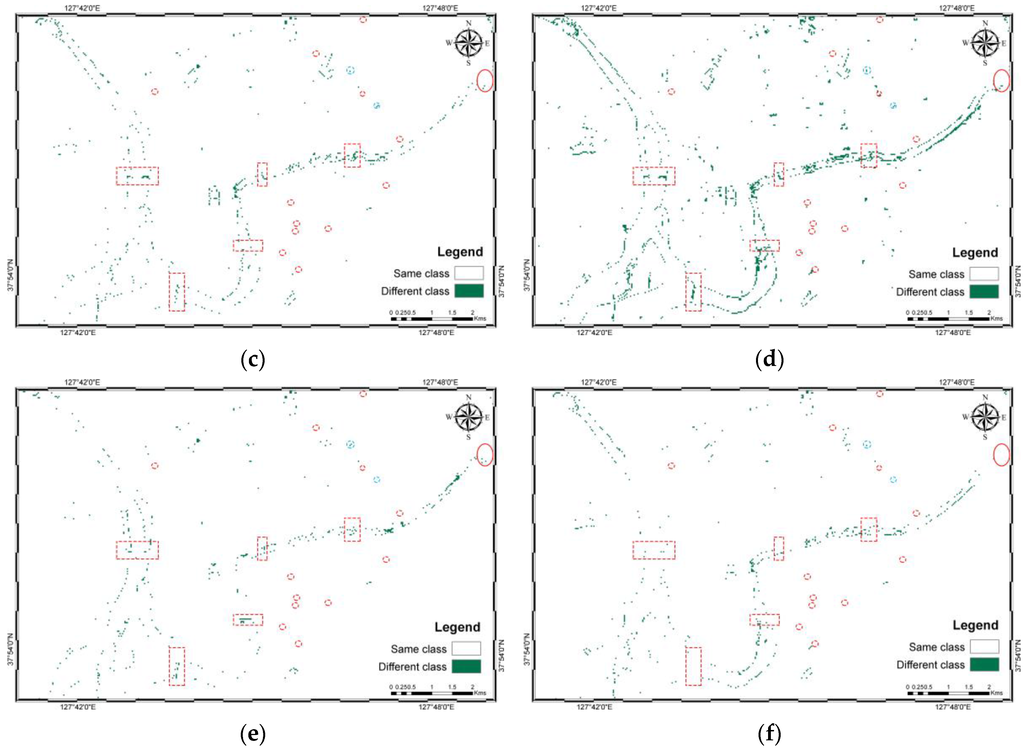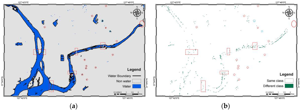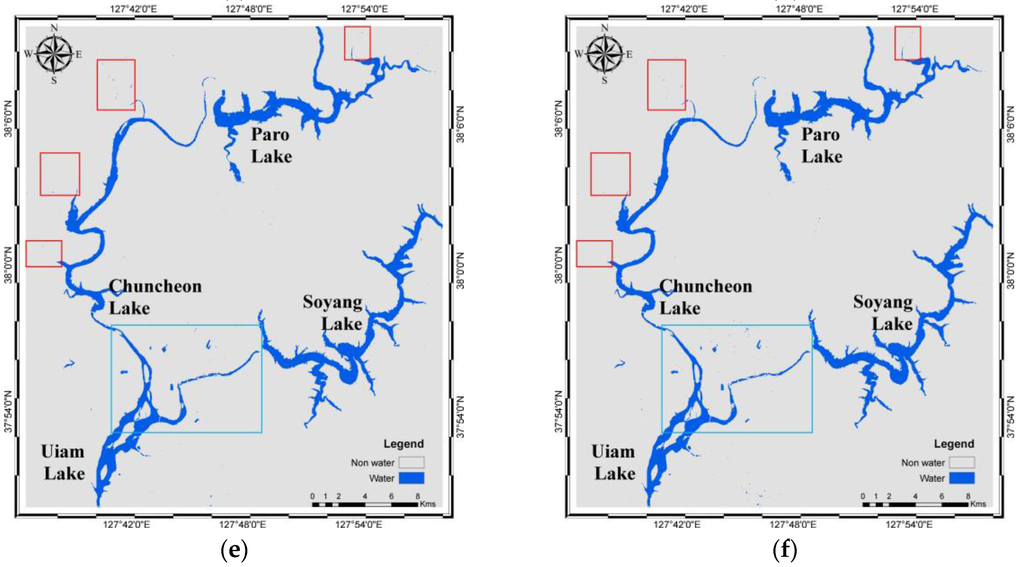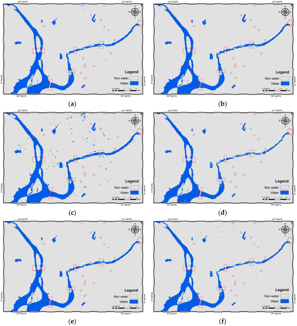 Figure 5 shows the central part of the study area (light blue box in Figure 4), with smaller water bodies in a complex urban area and a lake with bridges. In the figure, the red oval is an earthen dam at Soyang Lake, which is well-identified by all of the methods. Similarly, the red dotted boxes show the bridges in the figures. The bridges have been well identified and are parallel to the axes of pixels, except in the case of MNDWI, and somewhat in NDWI. The misidentification is due to the shadows of overhead structures on and under the bridge. Water bodies (light blue dotted circles) larger than 30 m × 30 m, which is the spatial resolution of OLI, were successfully identified, whereas smaller (red dotted circles) water bodies were not. The spatial resolution plays an important role in pixel-based classification of multispectral imagery, which limited the identification of smaller water bodies. The same reason caused variation in classification of water bodies at land-water boundaries. Figure 6b–f shows that the mixed pixels at the edges of water bodies are often misclassified.