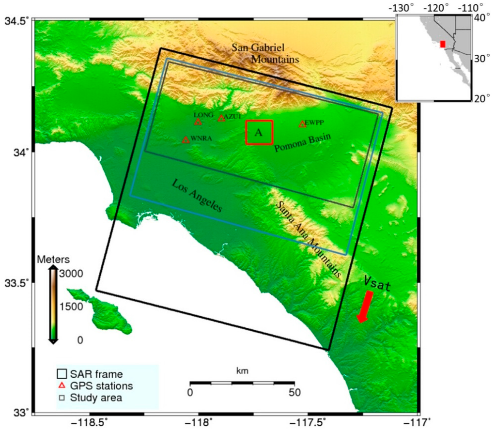 In order to verify the feasibility and advantages of our robust estimation method, we tested the approach on InSAR data from an experimental region about 100 km2 in size, the dataset is shown in Table 1. In the experimental region A (red rectangle in Figure 1), a small-scale deformation area located at Pomona appears to reflect water withdrawal. We estimated the local phase-elevation ratio assuming the linear model (Equation (1)) with conventional least squares method and the robust estimation method, respectively. Table 3 shows the improvement in the standard deviation values after applying our robust estimation method. These results suggest that this robust estimation method yields the phase-elevation ratio more robustly and reliably.
