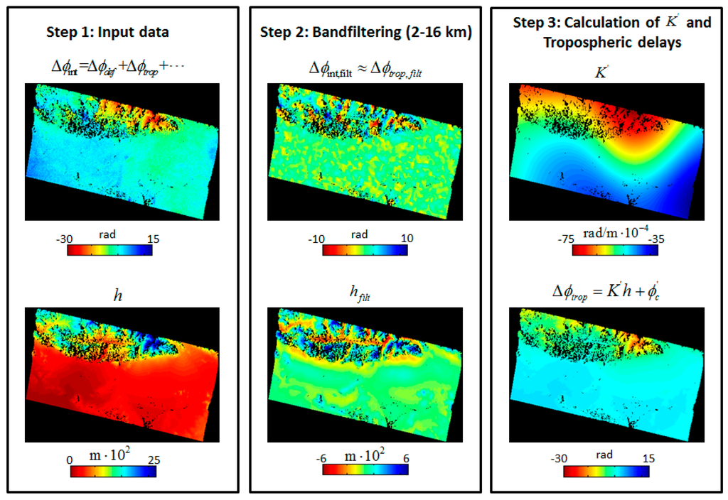 A number of methods have been developed to correct the tropospheric delay in InSAR data [5,6,7]. These correction techniques can be classified into two groups: methods based on auxiliary data and methods based on the interferometric phase itself. The methods producing synthetic delay maps by using auxiliary data sets directly to correct the tropospheric delay in interferograms. This includes the use of GPS wet delay measurements [8,9,10], local meteorological data [11], multispectral remote sensing imagery [12,13], and local or global meteorological reanalysis products [14,15]. Ground-based GPS measurements are typically sparse, while multispectral remote sensing imagery such as MODIS and MERIS can only provide measurements during daytime and has a low accuracy in the presence of clouds. The local or global meteorological models have large grid spacing; and are not sufficient for simulating smaller scale tropospheric effects such as those associated with turbulent mixing [15]. In addition, the atmospheric models are not always available at the acquisition time for each SAR image.