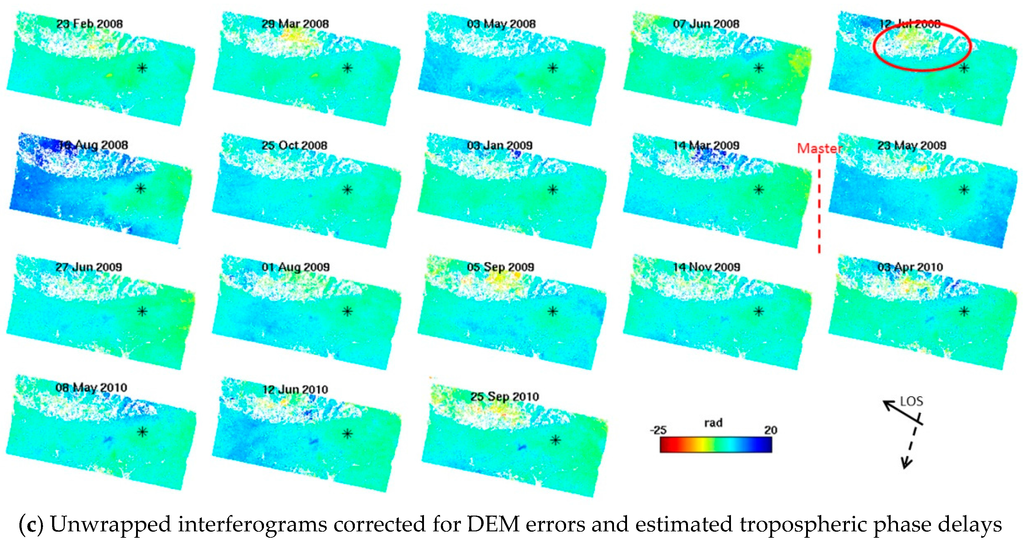 We used StaMPS software to perform InSAR time series analysis and to estimate DEM errors. After PS selection and DEM error correction, the interferograms were unwrapped in three dimensions [24]. The unwrapped time series interferograms after the DEM errors were removed are shown in Figure 3a. The signals in these unwrapped interferograms consist of the contribution of the ground deformation, which we are interested in understanding and the tropospheric phase delay that must be removed. Note that the spatial-temporal filtering in StaMPS is not used to estimate the tropospheric delay. Instead we used our RMW method to calculate the delays for individual interferograms.