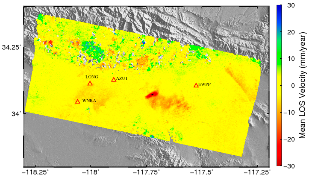 The spatial map of estimated from our RMW method is shown in Figure 3b. Figure 3c shows the interferograms that the tropospheric phase delay estimated by our RMW method has been subtracted. Finally, the mean-velocity map over the study area was obtained (Figure 4). Subsidence in the Pomona Basin can be observed in the unwrapped interfergrams (Figure 3a) and the mean-velocity map (Figure 4).