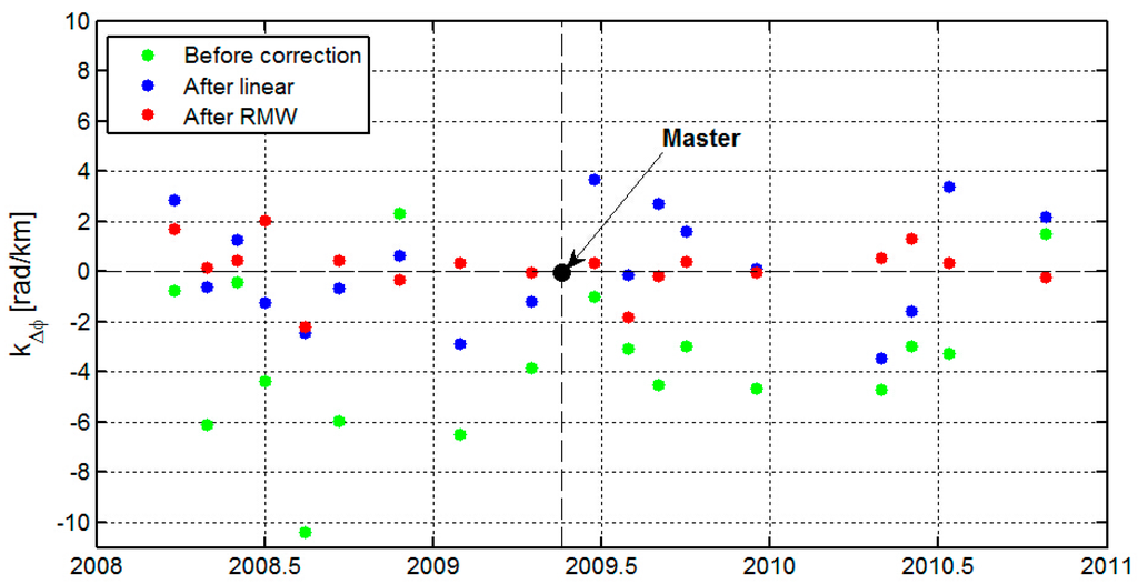 On average, we found a strong local relationship |kΔφ| of 3.9 rad/km (~1.7 cm/km) for our 18 interferograms before the tropospheric correction (the green points shown in Figure 5). After the linear correction method (blue points), we found an average reduction in the local correlation to topography of 2.0 rad/km (~0.9 cm/km). However, the local correlation increased at an average value of 1.3 rad/km (~0.6 cm/km) in the 23 February 2008, 3 May 2008, 23 May 2009, 12 June 2010, and 25 September 2010 interferograms.