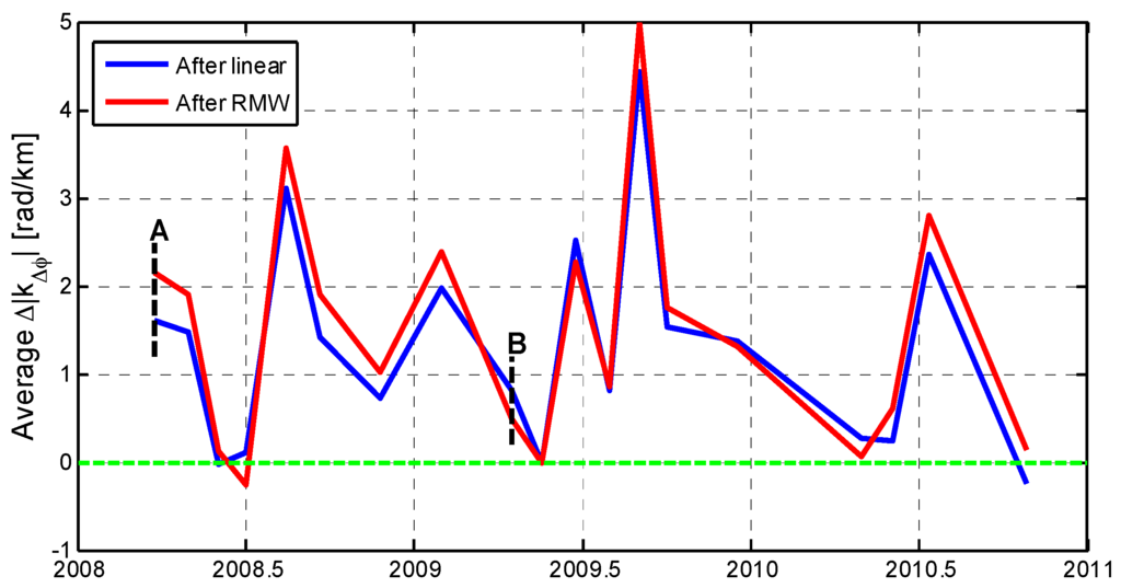 The difference value indicates a reduction or increase in local correlation with topography before and after tropospheric correction. This graph shows a comparison of the average in the center of 28 blocks for the corresponding interferogram after the correction for the linear (blue solid line) and RMW methods (red solid line). A comparison of A and B indicated by dashed black lines are specifically shown in Figure 8.