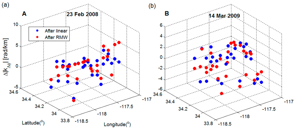 After treatment with the RMW method (red points), we found an average reduction in local correlation with topography of 3.1 rad/km (~1.4 cm/km), about three fourth of the signal, with the increase only for 23 February 2008 (0.9 rad/km or 0.4 cm/km) interferogram. The strongest reductions were observed in the 12 July 2008 (8.2 rad/km or 3.7 cm/km) and 3 January 2009 (6.2 rad/km or 2.8 cm/km) interferograms. Figure 6 shows the two interferograms with the strongest reduction results before and after the tropospheric corrections. These two interferograms show the reductions in local correlation with topography of 8.0 rad/km (~3.6 cm/km) and 3.6 rad/km (~1.6 cm/km) using the linear method. The RMW method however performs better, with reductions of 8.2 rad/km (3.7 cm/km) and 6.2 rad/km (2.8 cm/km). These comparative results show that the RMW method outperforms the conventional linear method. Additionally, taking the 23 February 2008 interferogram as an example, the local correlation increased 2.1 rad/km (~0.9 cm/km) while the correlation based on the full interferogram decreased 3.6 rad/km (~1.6 cm/km) after the linear correction. The increase in local correlation was due to the spatial variation of the troposphere, which cannot be captured using the linear method. Thus, the linear method estimated the phase-elevation ratio by a conventional LS method based on the whole interferogram and did not account for inconsistent filter bands and spatially variable tropospheric delays.