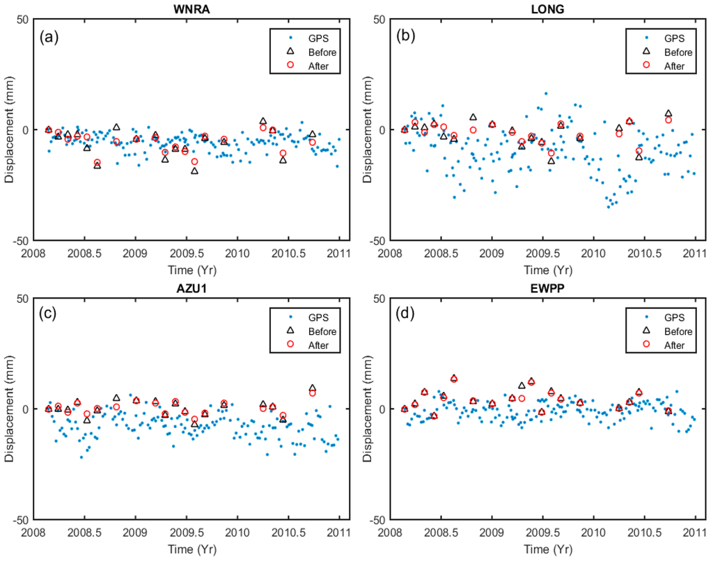 In order to validate our results, we compared the time series of LOS displacements measured by GPS to displacements measured by InSAR. We used four GPS stations from the Southern California Integrated GPS Network (SCIGN) for our comparison. The North, East, and Up direction displacement from GPS were projected to LOS direction for comparison. In Figure 9, we show the time series plots of measurements from the four GPS stations and ground displacement as estimated from InSAR images. The black triangles in Figure 9 represent displacement as estimated from InSAR without tropospheric correction, and the red circles indicate the displacement where the tropospheric delay was mitigated using our proposed RMW method. Because the GPS stations are located on flat terrain, topographically correlated tropospheric effects are not significant. The RMS errors before tropospheric correction on GPS stations are WNRA (14.22) mm, LONG (18.55 mm), AZU1 (11.57 mm) and EWPP (7.65 mm), after correction the RMS error was reduced to 10.79 mm, 16.26 mm, 10.88 mm and 5.51 mm, respectively. These comparisons support our argument that the proposed RMW method is quite effective for mitigating the topographically correlated tropospheric delay and thus enables the extraction of more reliable surface deformation information.