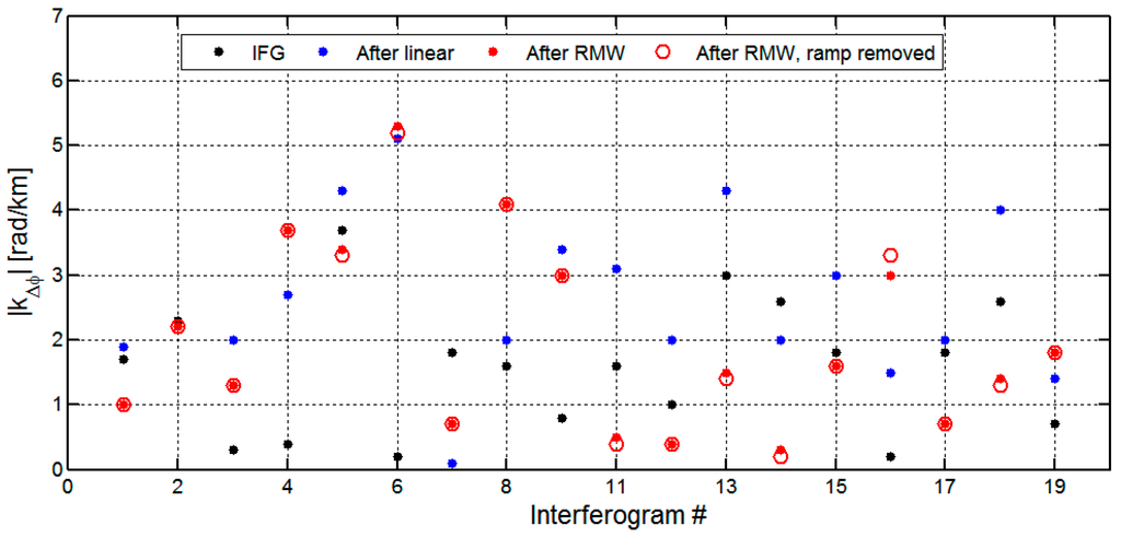 In this section, we will discuss how the orbital ramp influences the estimate of the phase-elevation ratio . To do this, we compare our results with the values derived from the RMW method with the ramp retained and removed (Figure 10). For the full interferogram, on average we found a reduction in local correlation with topography of 1.0 rad/km (~0.5 cm/km) for 11 interferograms after correction with our RMW method. Among these interferograms, the local correlation increased with an average value of 0.5 rad/km (0.2 cm/km) after the linear method correction. The RMW method performed more efficiently in comparison to the linear method with reductions of correlation in 10 out of 11 interferograms. To account for residual orbital errors, the original interferogram was corrected with a plane trend in the range and azimuth before applying our RMW method. Figure 10 illustrates that the local correlation estimated from the ramp-retained RMW method is almost the same as the local correlation estimated from the ramp-removed RMW method. This suggests that our RMW method is insensitive to the influence of the orbital ramp and therefore can estimate the tropospheric delay even when orbital errors or long wavelength deformation signals are present.