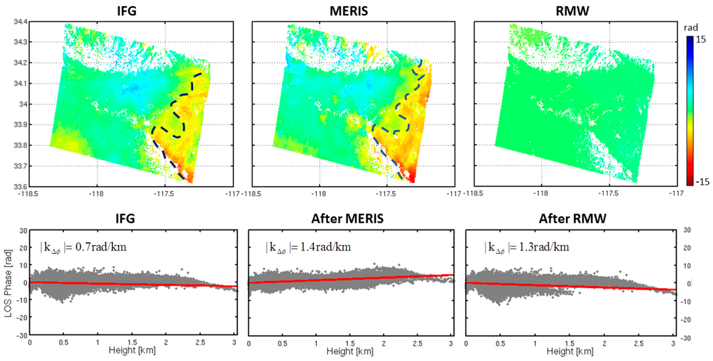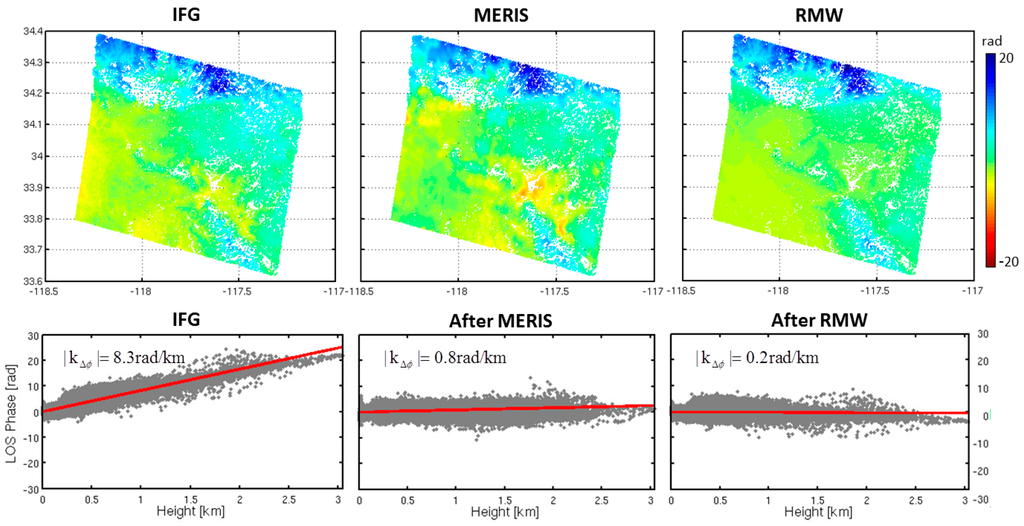 A comparison of the performance of the MERIS correction and the RMW method correction. A stratified dominant interferogram was generated using two SAR acquisitions on 16 August 2008 and 25 October 2008 by the Envisat satellite over California. The average B⊥ is 272 m. The original interferogram has been corrected for the residual orbital errors. The tropospheric delay has a strong linear relationship with elevation. The prediction of tropospheric delay using MERIS and the RMW method show a good agreement, with a difference in the standard deviation of 0.1 rad along the LOS. The standard deviation of the residuals after correction using MERIS data was about 1.6 rad and 1.7 rad after correction with the RMW method. The standard deviation reduction after correction with the RMW method was about 55%.
