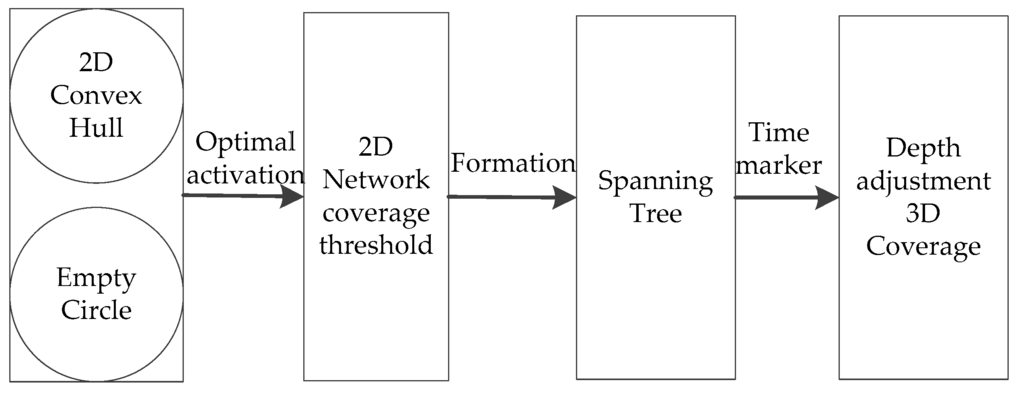 The main ideas of the NDACS algorithm can be described as the following steps: (1) optimal activation strategy based on 2D convex hull and empty circle on the water surface; (2) formation process of a 2D convex hull spanning tree; (3) and depth-adjustment strategy based on time markers in achieving 3D network coverage. The algorithm framework is shown in Figure 4.