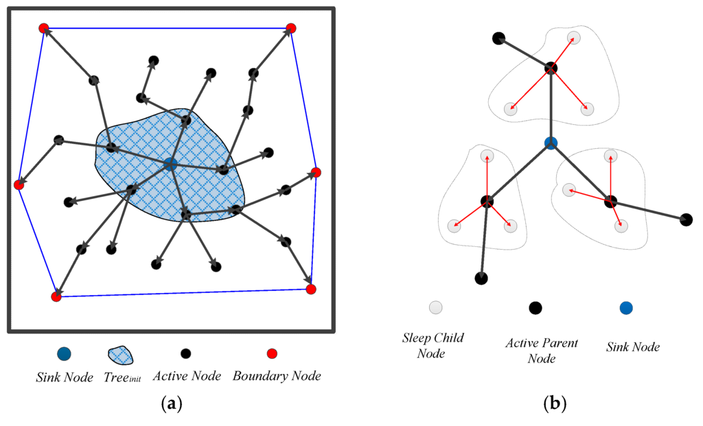 - The active node inside the 2D convex hull Sa_in (IDA) acts as the parent of its neighboring sleeping nodes. Building a small spanning tree of individual nodes on Forestinit, we define a small spanning tree consisting of hybrid construction where the parent is the active node and the child is the sleeping node, as shown in Figure 7b.