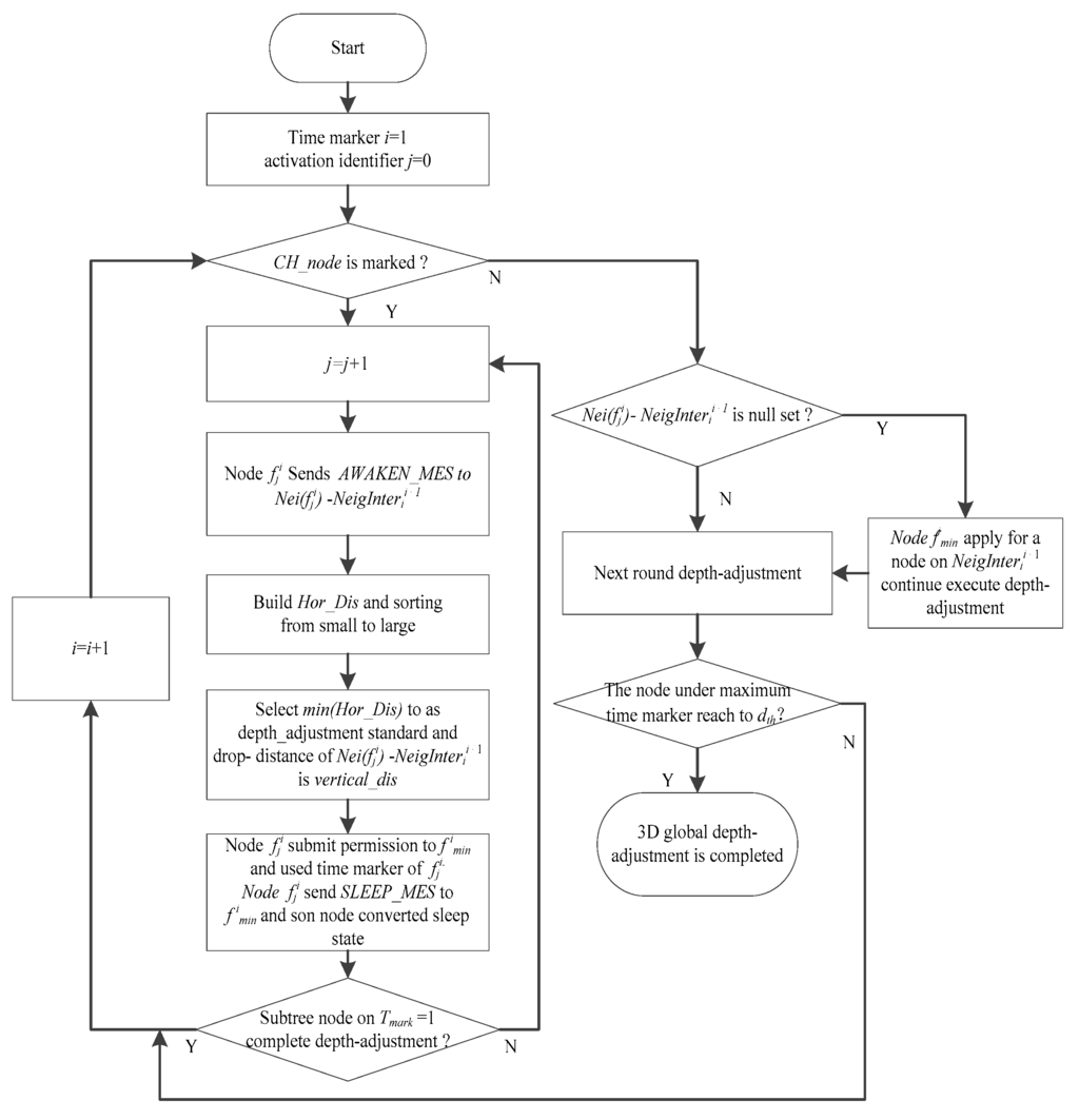 - To achieve the 3D global network coverage, the algorithm needs to deploy neighboring sleeping nodes Nei(fji) distributed at different depths and calculate the depth adjustment of the set of subtree parent nodes {fji} for their child sleeping nodes.
